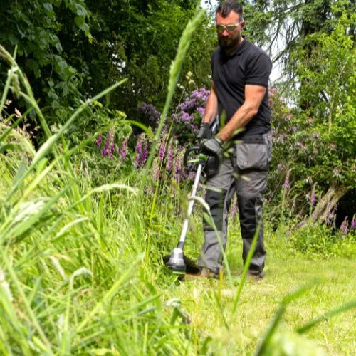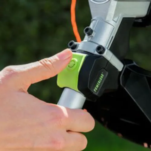 חרמש נטען בעל מוט טלסקופי המאפשר כיוון מדויק של הכלי בהתאם לאורך הזרוע של המפעיל.